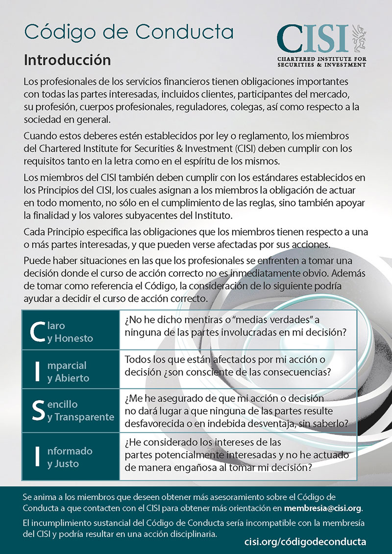 El CISI cree que el nivel de integridad en el sector de los mercados mayorista / de capitales necesita estar, al menos, al nivel del sector minorista. Esto también proporcionará al público alguna evidencia tangible que demuestre que los bancos y otras organizaciones financieras están cambiando realmente su cultura.